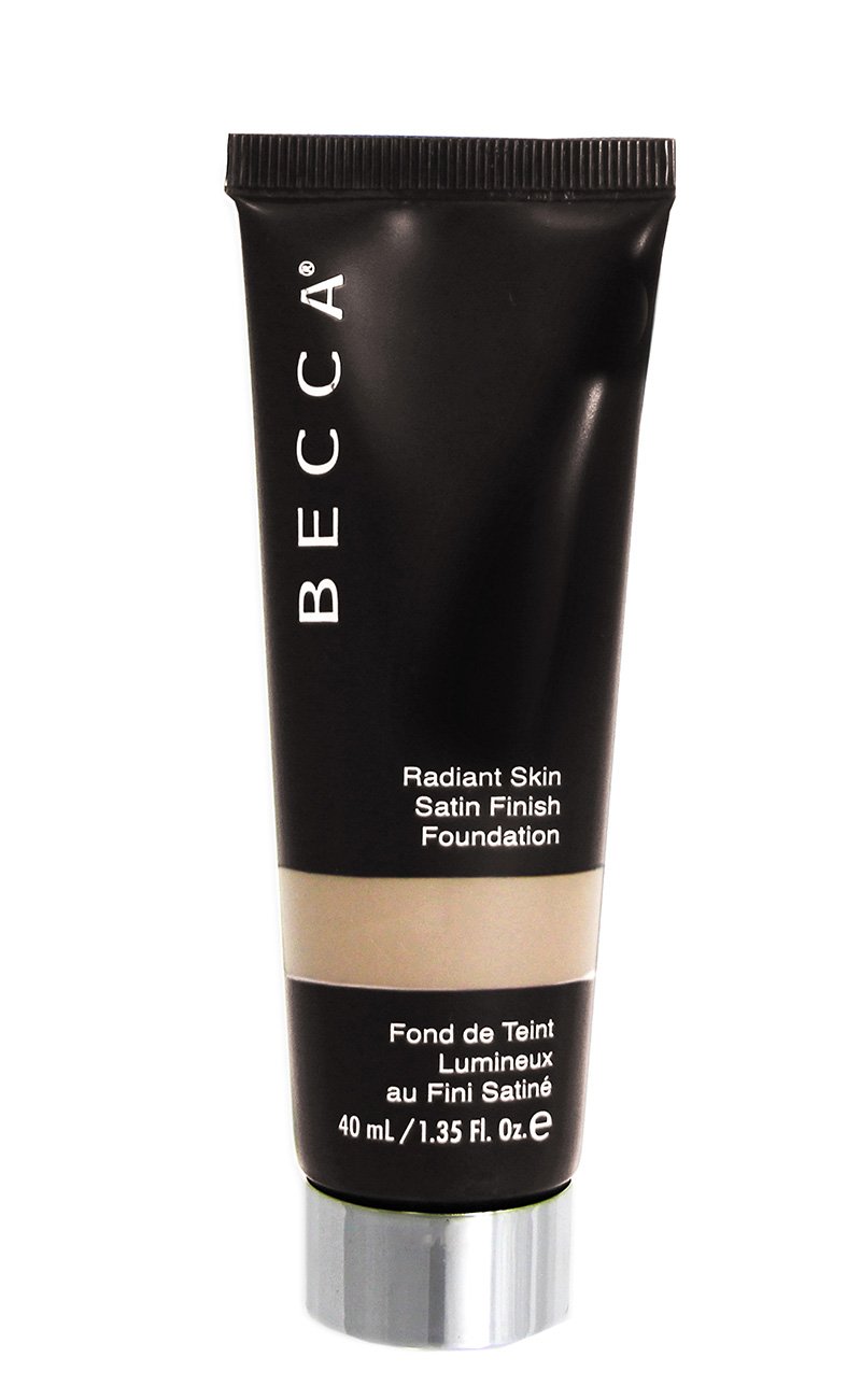 Becca Radiant Skin Satin Finish Foundation in Shell, a lightweight liquid foundation that delivers a natural glow